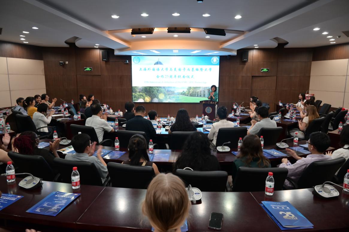 2025年7月14日下午,上海外国语大学与美国卡内基梅隆大学合作25周年纪念仪式在上海外国语大学虹口校区会议中心第二报告厅隆重举行。两校师生代表、学界嘉宾齐聚一堂,共同回顾两校25载合作历程,展望未来教育愿景。校长李岩松出席仪式并致辞。美国卡内基梅隆大学全球战略倡议与机构认证副校长丽莎·科里克(Lisa Krieg)视频致辞。仪式由中文学院/国际文化交流学院党委书记张艳莉主持。