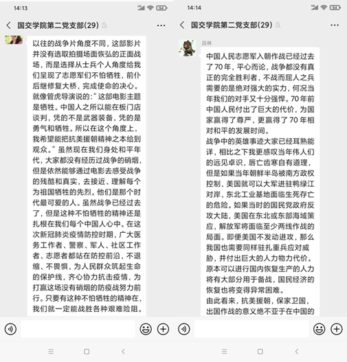 观影结束以后,党支部组织党员就活动内容进行了观影学习心得交流。支部党员围绕抗美援朝战争的历史意义并结合当下正在进行的抗击新冠病毒斗争发表了自己的观影体会。