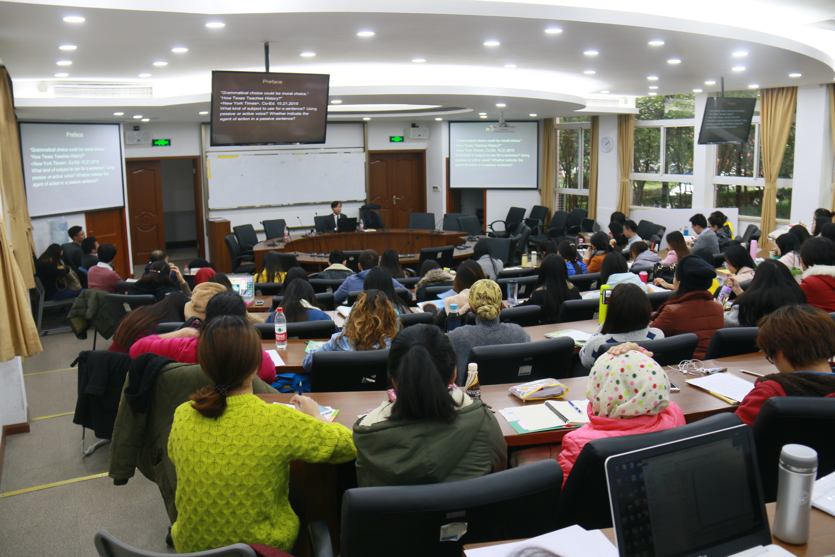 讲座开始时,刘教授取2015年10月21日的纽约时报社论为例,从其行文中的语法参项入手管窥德州历史教材对待美国历史上的黑人奴隶问题的回避心态,例句信手拈来,讲解独到而细致,最终得出Grammatical choices could be moral choices的论断,令在座学子倍受启发,不禁令人感叹“世事洞明皆学问,人情练达即文章。”