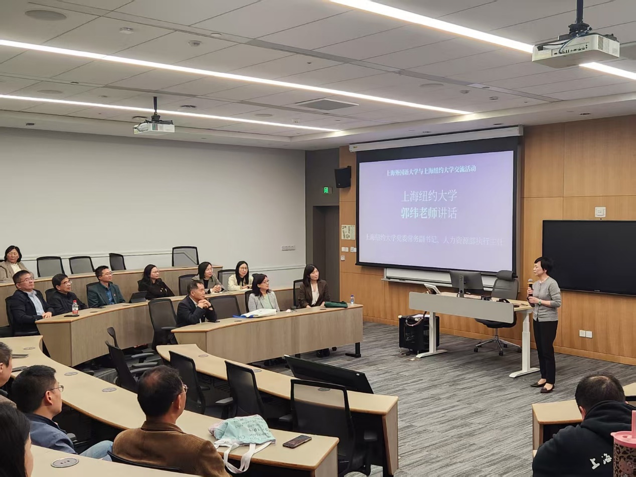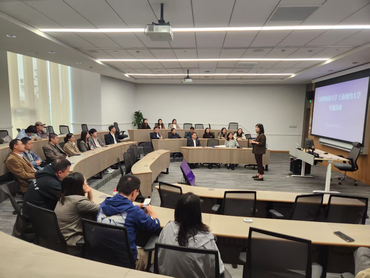 上海纽约大学党委常务副书记、人力资源部执行主任郭纬对学院一行到访表示热烈欢迎。她介绍了学校办学定位、全球校区布局、学科建设体系及党建工作开展情况,高度肯定了上外国际化人才培养质量。上海纽约大学全球中国学副教授、中文语言项目主任邹昕围绕全球中国学建设、中文课程体系、沉浸式暑期班运营、国际化人才培养等作了详细分享。
