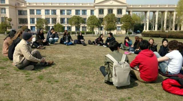 朱家角是著名的江南水乡,四周群湖环抱,河港纵横,小船穿梭往来其中。留学生乘坐小船穿行其中,体验了古镇的独特风貌和与现代生活交融的生活节奏。中午前往我校松江校区,在食堂与前来陪同参观的中国同学共进了简单的午餐,稍做休息后一起对校区进行了参观,在参观过程中,同学们对我校的情况做了简单的了解,和中国同学一起进行了交流,甚至还在草坪上坐下来一起做游戏,促进了中外同学的共融。