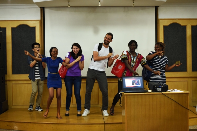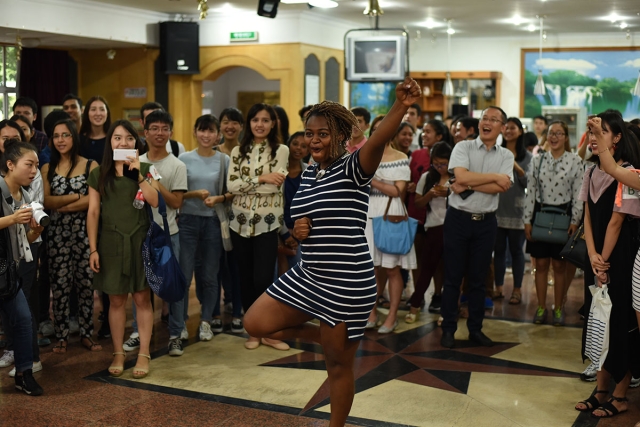 见面会后,国际文化交流学还安排了下午茶和文艺表演。活动在一曲中国传统乐曲《瑶族舞曲》的葫芦丝吹奏中拉开帷幕。作为奖学金生们的语伴,2016级汉语国际教育的中国学生们与奖学金生在风趣欢乐的小游戏中展开了愉快的互动。中国研究生还为奖学金生表演了古筝、唱歌等。在现场欢乐的气氛中,留学生也在现场进行了即兴表演。通过一系列的游戏活动破冰,孔子学院奖学金生们跟语伴们很快就熟悉了起来。在未来的一年中,中国研究生语伴将帮助奖学金生们解决学习与生活中的各种问题。