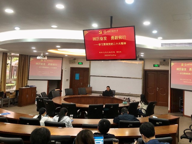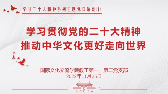 全院教职工大会结束后,学院教工第一、第二党支部组织党员教师开展了“学习贯彻党的二十大精神,推动中华文化更好走向世界”的主题党日活动,全体党员教师以线上线下相结合的方式认真聆听了学院杨四平教授做的主题报告《推动中华文化更好走向世界》。