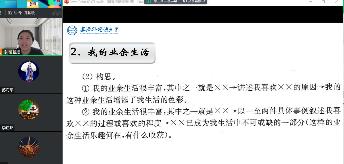 本次培训由上海外国语大学国际文化交流学院负责实施,采用大班录播课和小班直播课相结合的模式,将学员分别编入13个小班,在本院资深培训师的指导下,通过集中授课、小班交流、在线辅导和课后自主练习等多种形式,完成学习任务。