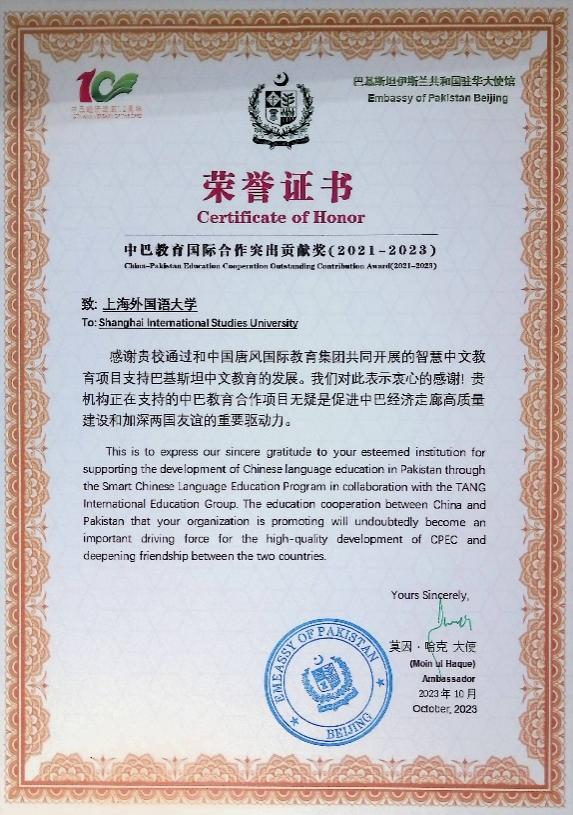 为感谢我校大力促进巴基斯坦中文教育发展,支持中巴经济走廊高质量建设,巴基斯坦驻华大使馆向我校颁发了“中巴教育国际合作突出贡献奖”。获奖证书由巴基斯坦驻华大使莫因·哈克亲自签发并加盖巴基斯坦驻华大使馆公章。