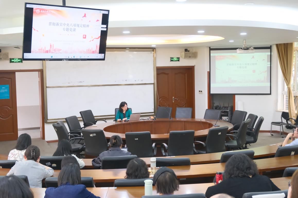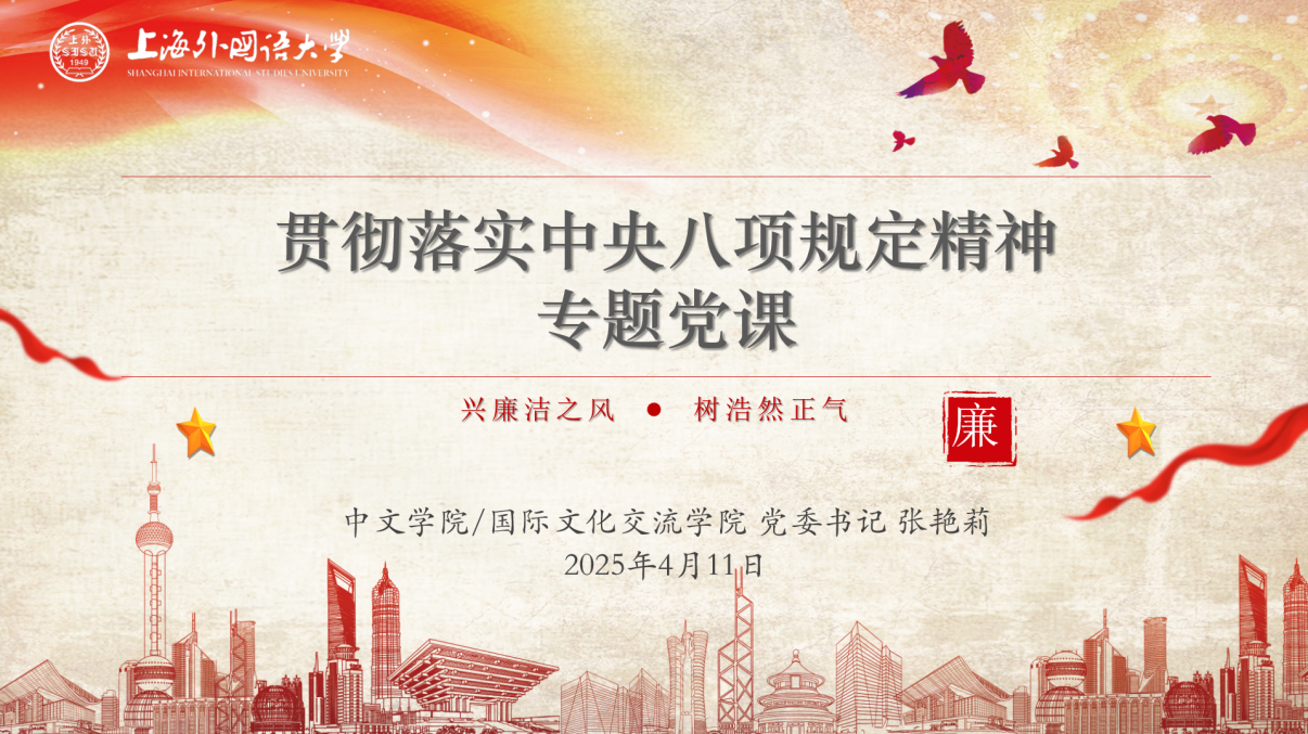 4月11日,上海外国语大学中文学院/国际文化交流学院在二号楼一梯开展贯彻落实中央八项规定精神专题党课,学院党委书记张艳莉担任领学人,全体教职员工参与。此次党课旨在深入学习习近平总书记关于加强党的作风建设重要论述,强化党员干部及全体教职人员对中央八项规定精神的理解与执行。